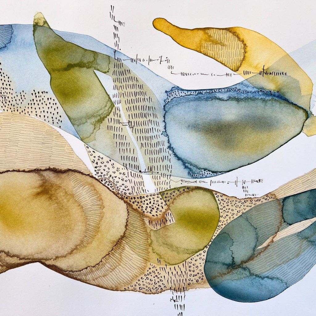 I create abstract work in watercolour and collage. Both offer the opportunity to create work using layers of transparency. There’s something compelling about transparency, about seeing beneath the surface, seeing what lies beneath.